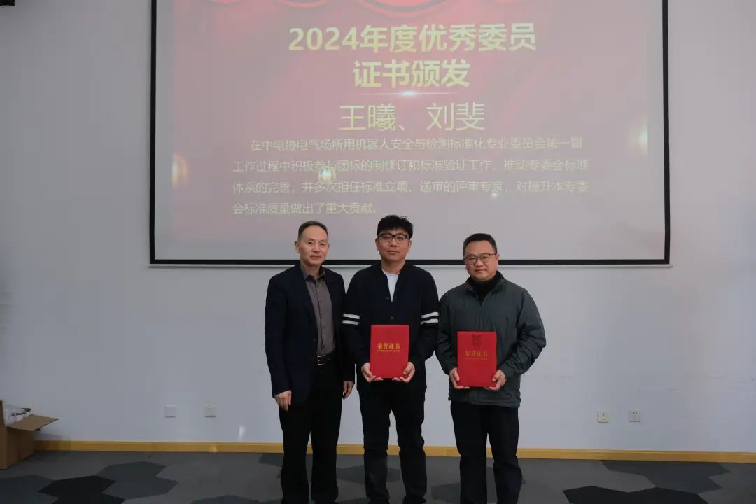 为鼓励和感谢大家对中电协机器人专委会工作的关注和支持,会上向“2024年度优秀委员”中家院(北京)检测认证有限公司王曦、上海擎朗智能科技有限公司刘斐颁发了优秀委员证书,向团体标准积极参与单位颁发了参编证书。