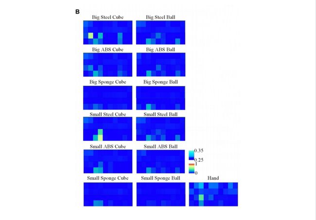 该团队还考虑了抓取时的不同方向和位置,下图显示的是:当机器手抓住这些物体时,传感器生成的信号图。