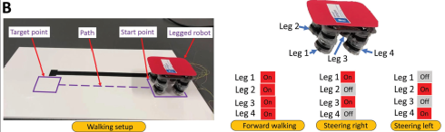因此,研究人员将这种驱动器组装成软体机器人,通过控制驱动器(机器人腿)的电压时序信号,控制机器人分别实现的循迹前进(速度为2.1mm/s)和转弯运动: